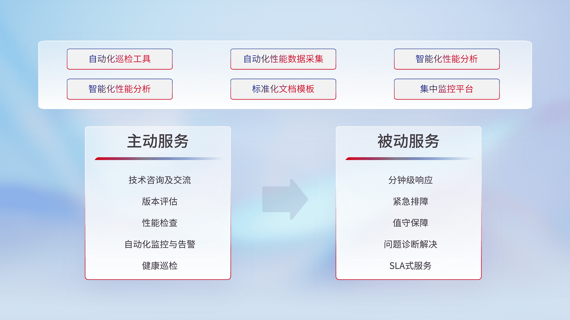 智能化工具和标准化文档,,,保障服务质量,,,提供主动服务(包含技术咨询、、、版本评估、、、性能检查、、自动化监控与告警、、健康巡检)和被动服务包含(分钟级响应、、、、紧急排障、、值守保障、、问题诊断解决、、SLA服务)。。